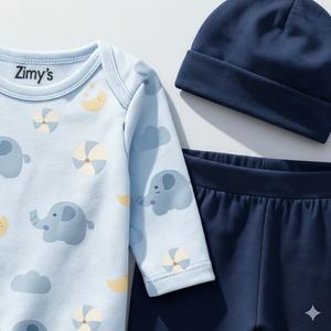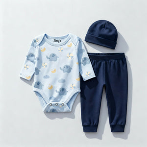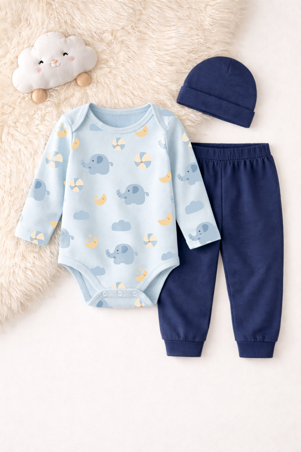 This sweet outfit features a soft light blue bodysuit decorated with cheerful elephant prints, paired with cozy navy pajama bottoms and a matching cap. Gentle, breathable, and comfy for all-day wear — it’s ideal for cuddles, playtime, and tiny adventures.