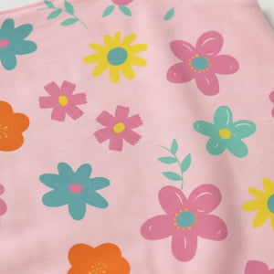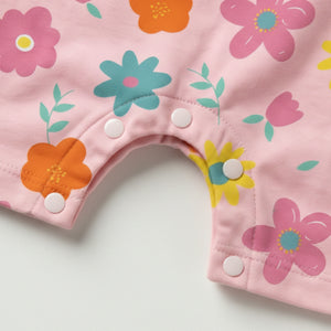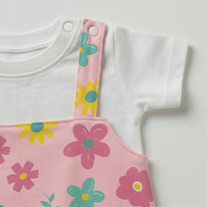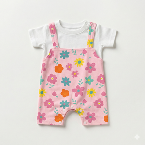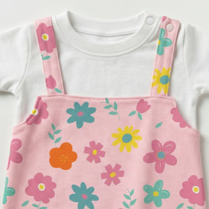 Our Blooming Garden Dungaree Romper features a colorful all-over floral print on a soft pink base, paired with a matching inner tee for a sweet and playful look.