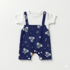 Our Cosmic Koala Dungaree Romper features an adorable all-over koala-in-space print with rockets, stars, and planets on a deep navy base, paired with a soft inner tee for a cute and comfy look.