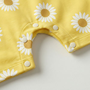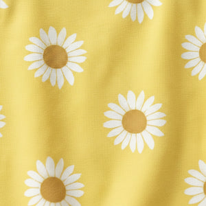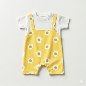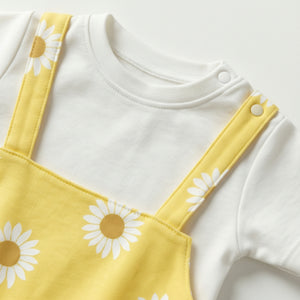 Our Sunflower Dungaree Romper features a beautiful all-over daisy print on a vibrant yellow base, paired with a soft inner tee for a sweet and playful look.