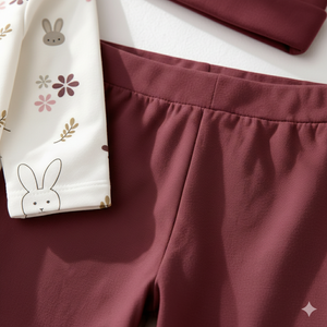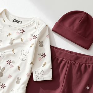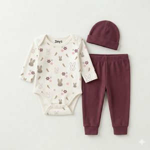 Sweet, cozy, and full of charm, the Bunny Blossom 3-piece set features an adorable bunny and floral printed bodysuit paired with rich mauve pajama bottoms and a matching cap. Designed for everyday comfort and cuteness, this set is perfect for lounging, playtime, and outings.
