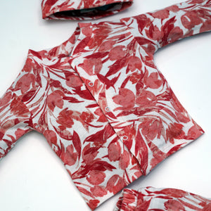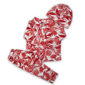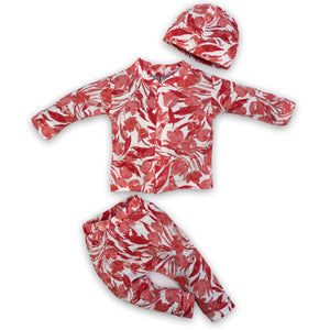 Brighten up your baby’s wardrobe with this 3-piece cotton set, featuring a vibrant orange abstract print. Complete with a shirt, matching pajama, and cap, this set offers bold style and cozy comfort for everyday wear.